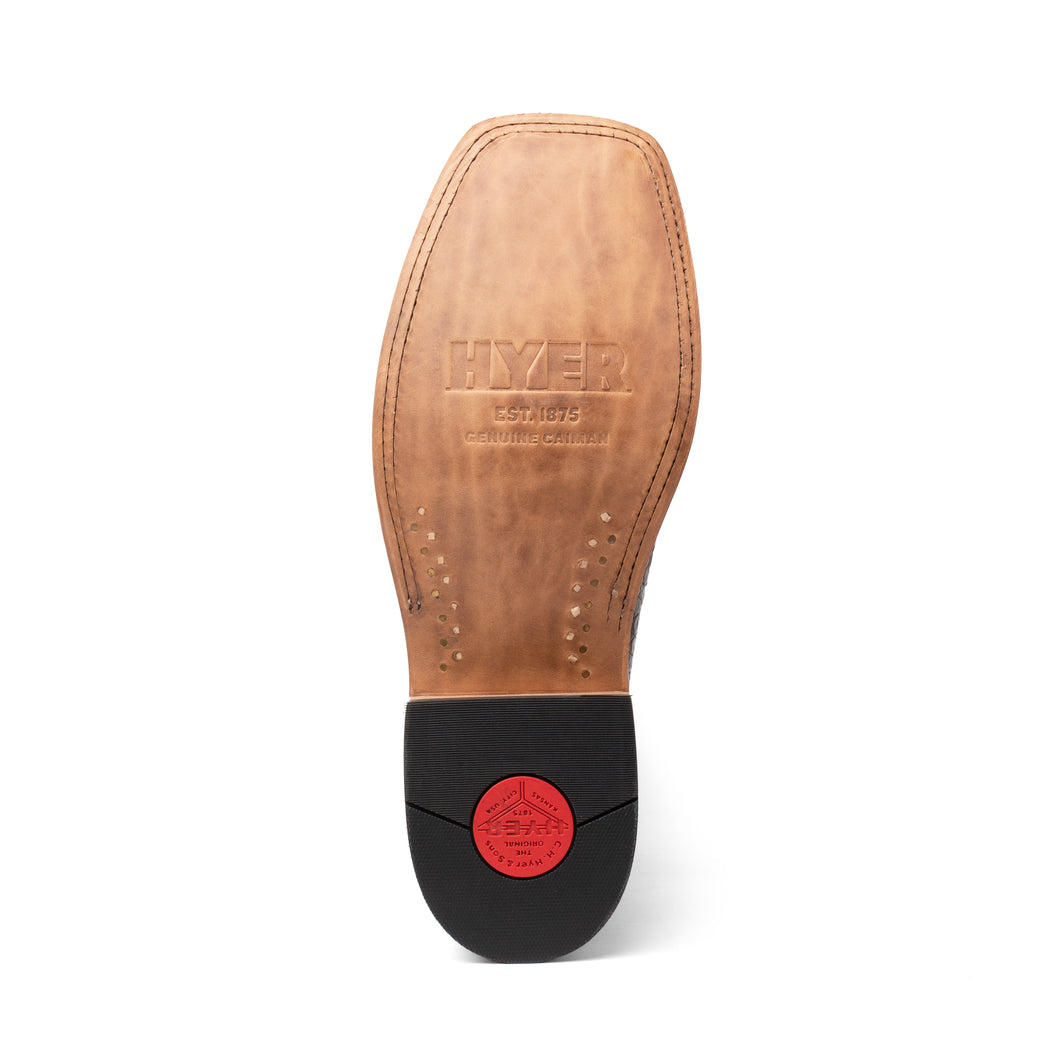 Hyer has blended their founder’s signature "Olathe Oak Leaf" stitch design with the rich texture of premium caiman crocodile and their popular broad square toe to craft a boot that commands attention and stands apart.