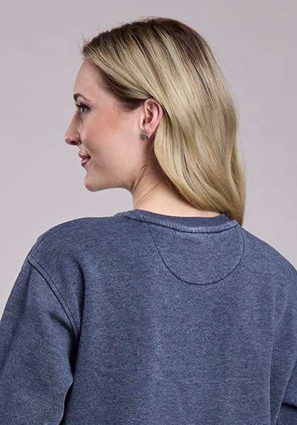 Gals Heather Navy Cotton Poly Blend Weathered Fleece Oversized Crew Neck Sweatshirt * Rib Knit Crew Neck, Cuffs And Waistband With Side Vents * Desert Long Horn Skull Sunset Screen Print On Center Front