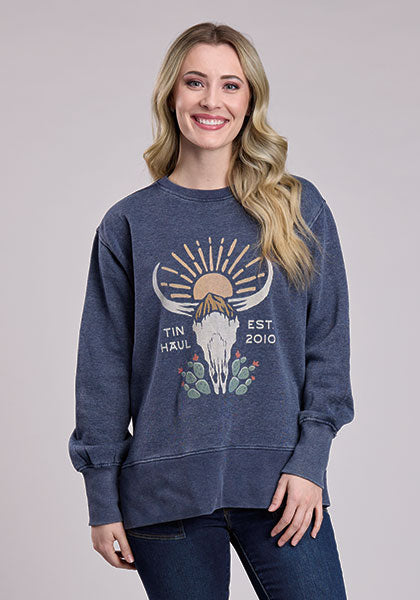 Women's Weathred Navy Tin Haul Desert Sunset with Longhorn Skull Sweatshirt
