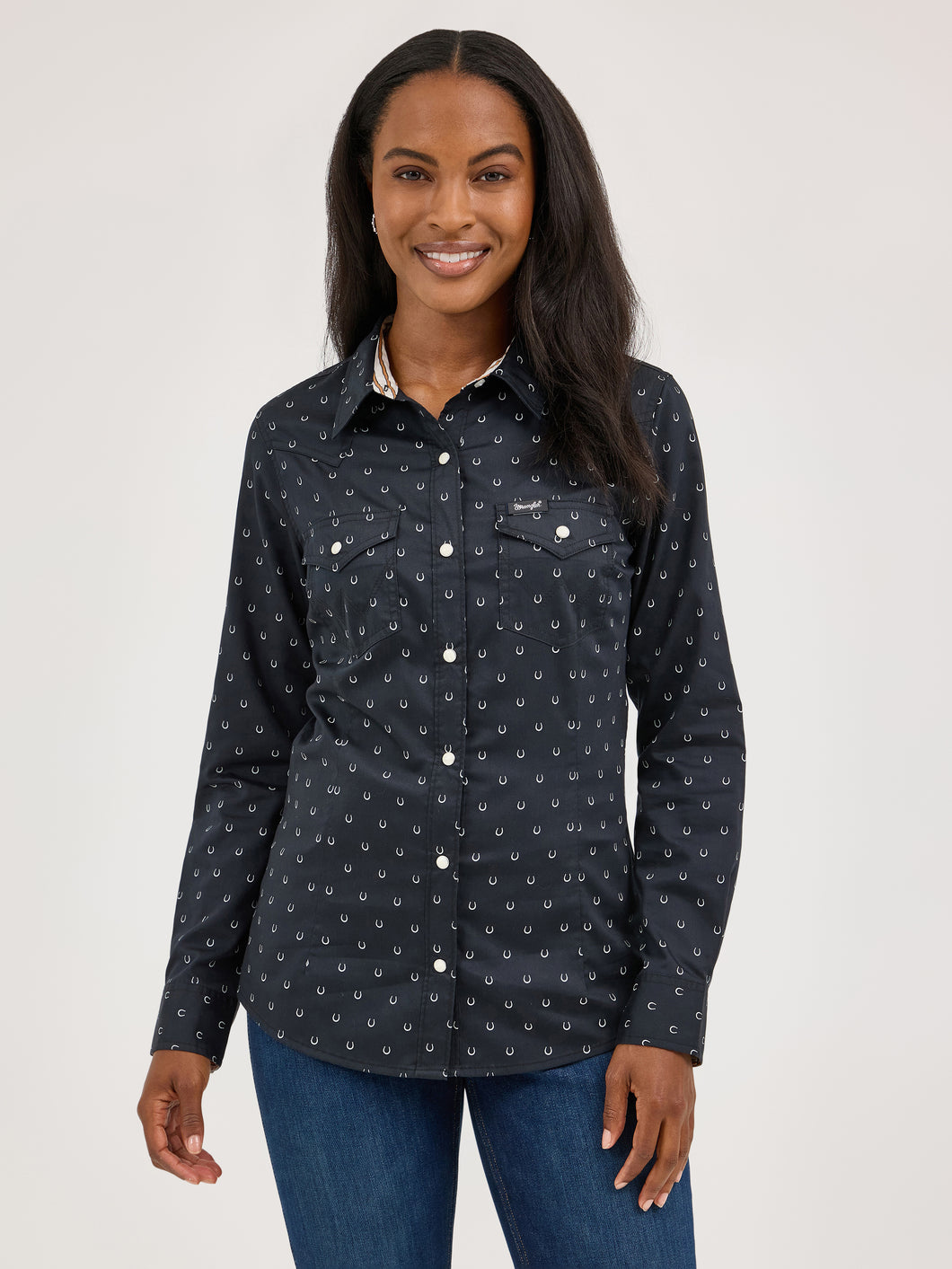 Wrangler Women's Black Horseshoe Print Snap Western Blouse