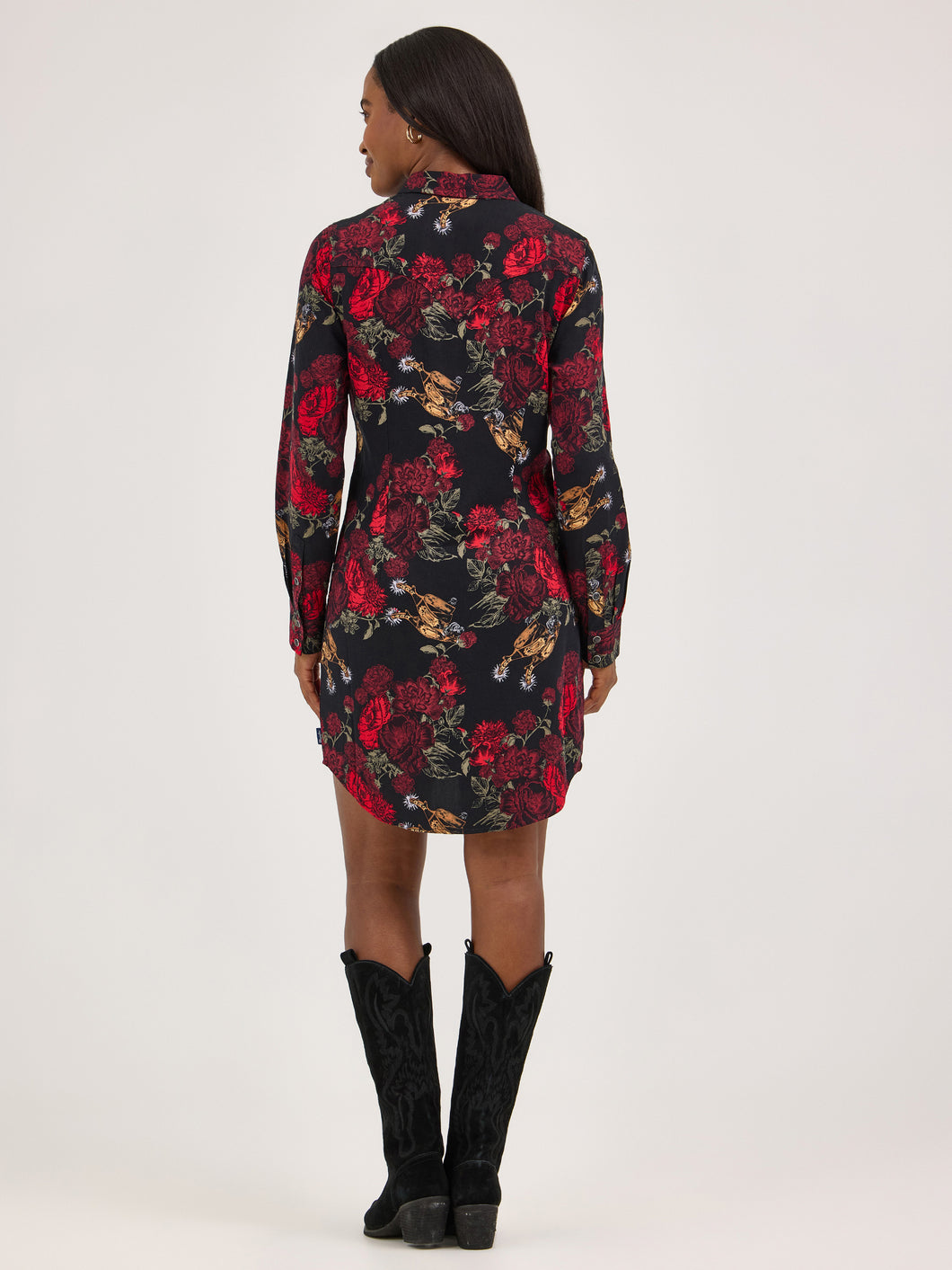Wear the florals you adore in the season to come with this Western Snap Mini Dress. Borrowing all those details you love about your favorite snap shirt, this dress comes with single-point yokes from front to back, chest flap pockets with the signature ‘W’ embroidery, and a full pearl snap front. It’s crafted for comfort and softness, completed with darts through the waist for extra definition and a romantic print full of red flowers and spurs.