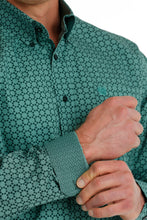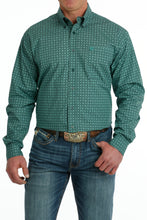 When your wardrobe calls for a refresh, reach for a handsome green printed cotton plain weave like this one engineered by CINCH. This shirt features turquoise geometric contrast trim, an open left front pocket with embroidered logo and green buttons.