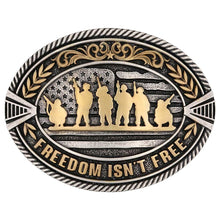 Show your strength with the Freedom Isn't Free Attitude Buckle. This unique buckle features seven gold finished soldier figure silhouettes as the focal point. An antiqued silver tone American flag serves as the background of the buckle. Gold finished filigree with a star at its center, olive branches and a smooth silver finished border encircle the soldier figures. The words "Freedom Isn’t Free" are boldly presented in gold tone. A striking silver tone twisted rope edge borders the buckle. Standard 1.5 inch swivel.