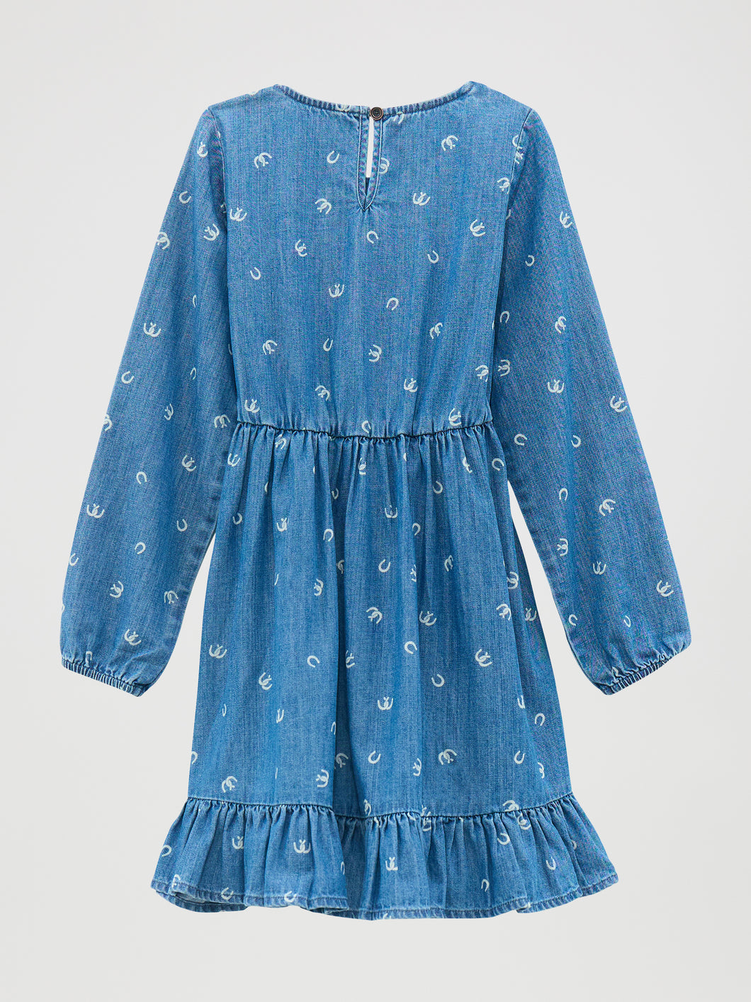 A classic denim dress every Wrangler® girl should have. This stylish long-sleeve dress prioritizes your little one's comfort no matter the season. This sweet silhouette is pleated at the front and features a ruffled detail at the hem for a dressy style that keeps her comfy.